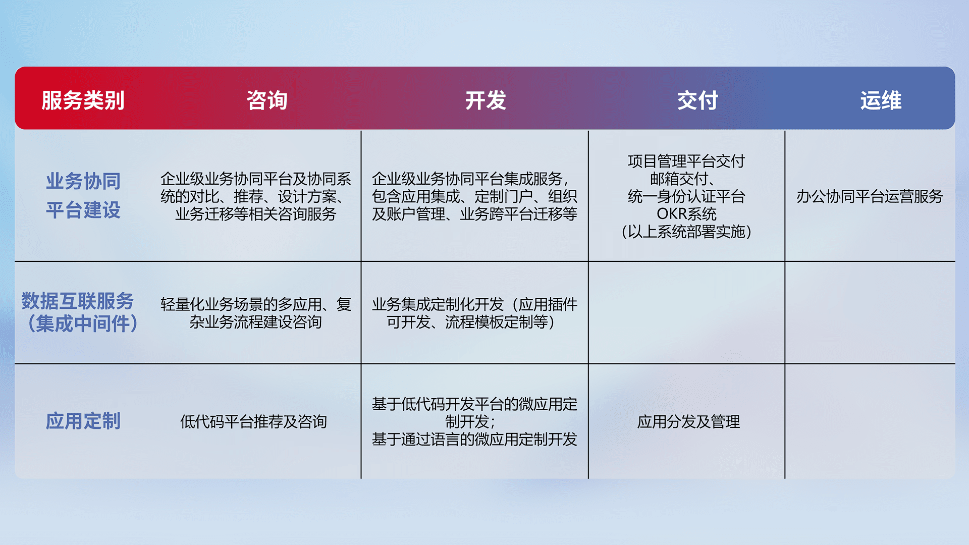 针对钉钉、、、、企微、、、IDaas等平台级产品提供产品的规划、、、方案、、、交付、、、、定制化开发等服务,,,,实现如统一协同办公、、智能客户服务、、、、混合会议管理、、智能数据查询、、、等业务场景,,,实现数字化转型。。。。