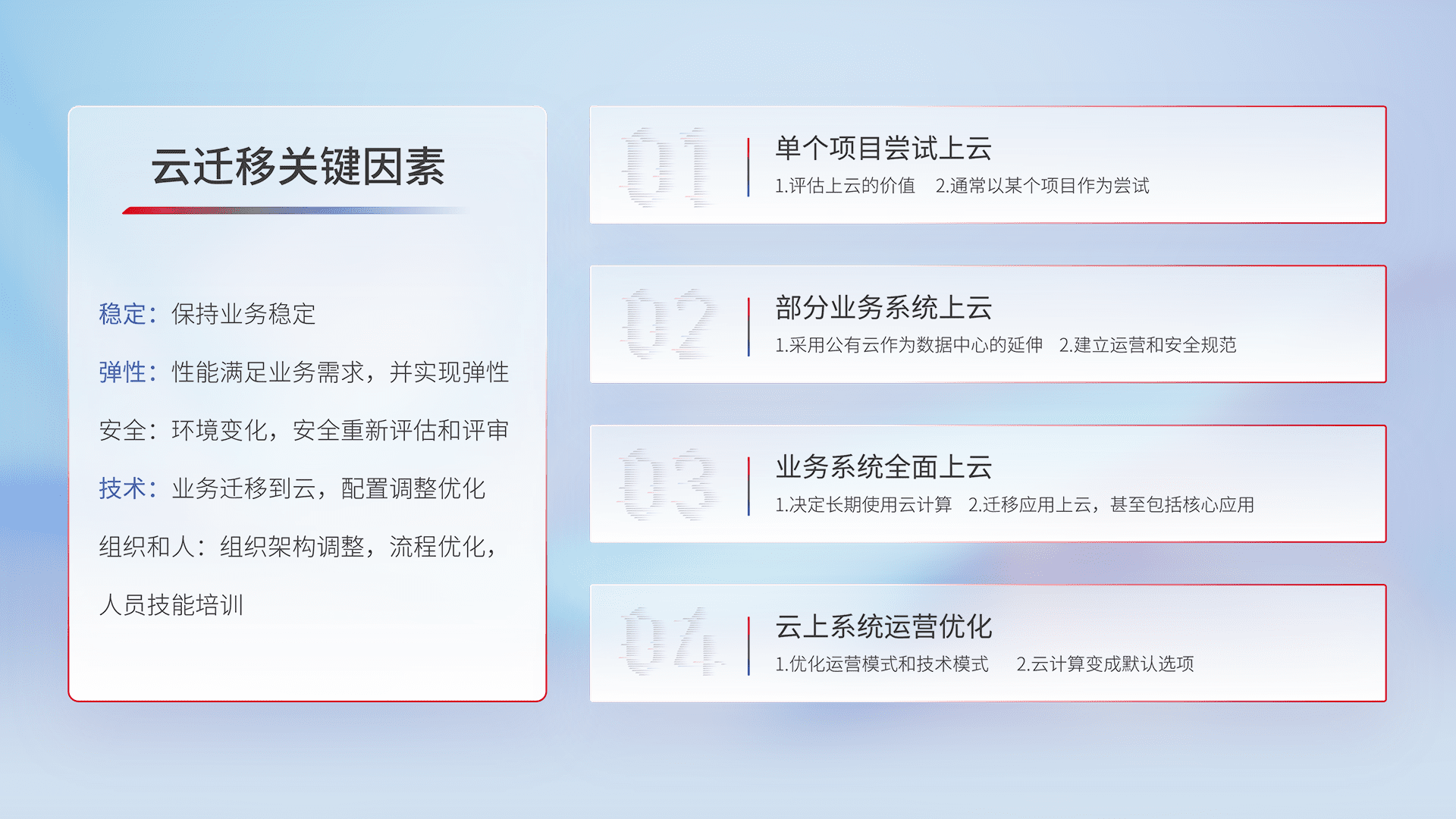 结合实际业务,,从规划设计、、云平台选型、、、云原生改造、、数据迁移、、集成交付,,,,迁移全过程为客户识别最佳上云路径,,,做好风险识别管理,,,,设计网络架构、、、身份权限、、安全审计合规、、、、操作审计、、、、日志审计、、、监控告警策略、、多站点容灾设计等,,,对云上基础设施进行整体规划,,,,提升IT治理水平,,以满足弹性、、、、高可用、、高性能的需求。。。。