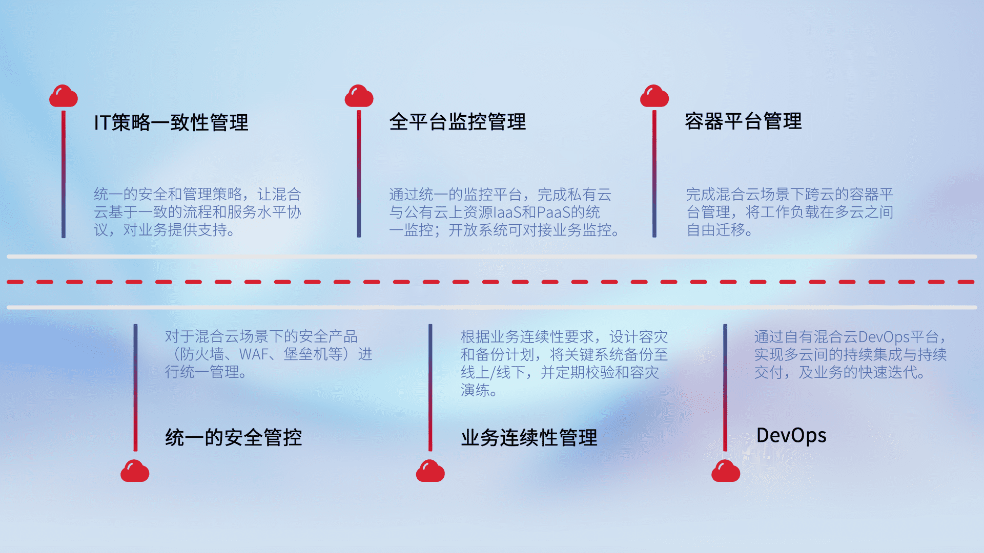 通过多云纳管,,,,以统一的资源数据模型把客户的云资源进行抽象和封装,,,进而实现对多云资源的统一操作,,,,保障云资源管理的可靠性、、、稳定性与可用性。。。量身定制化运维内容,,配置、、、开发运维、、补丁管理、、备份、、监控、、、认证和访问管理、、、、审计和日常巡检等,,,,保障在用云过程中的可靠度,,,稳定度以及高可用率。。。